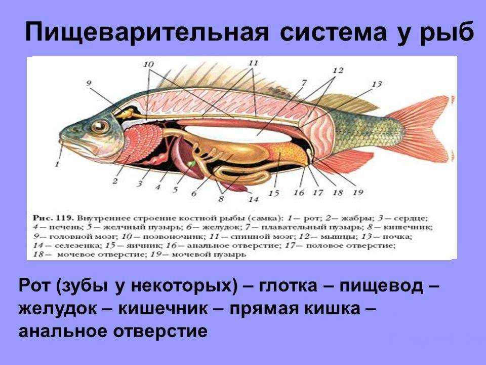 Объемистый, часто изогнутый в виде колена, желудок переходит в тонкую кишку (карповые рыбы желудка не имеют). У многих рыб на границе желудка и кишки расположены слепые пальцевидные (пилорические) отростки, служащие для увеличения пищеварительной поверхности. Кишка образует петли и открывается наружу анальным отверстием.