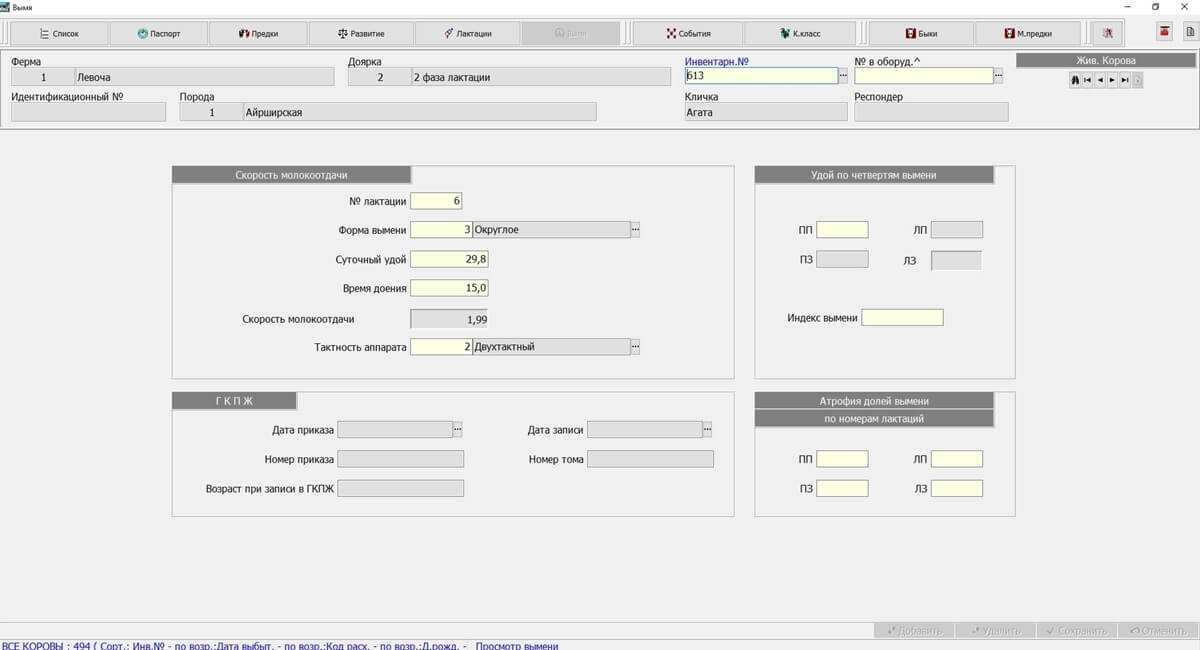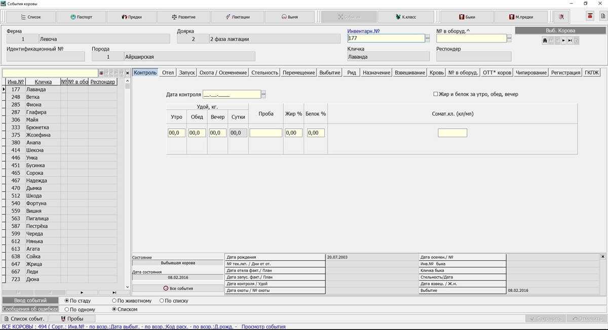 1. с вкладкой «События» (База данных — Картотека коровы/молодняк), где заполняются следующее поля: контроль (внесение каждый месяц результатов контрольных доек), отел коровы, запуск, осеменение, стельность (внесение результатов ректального исследования), выбытие, взвешивание и назначение (формирование структуры стада)