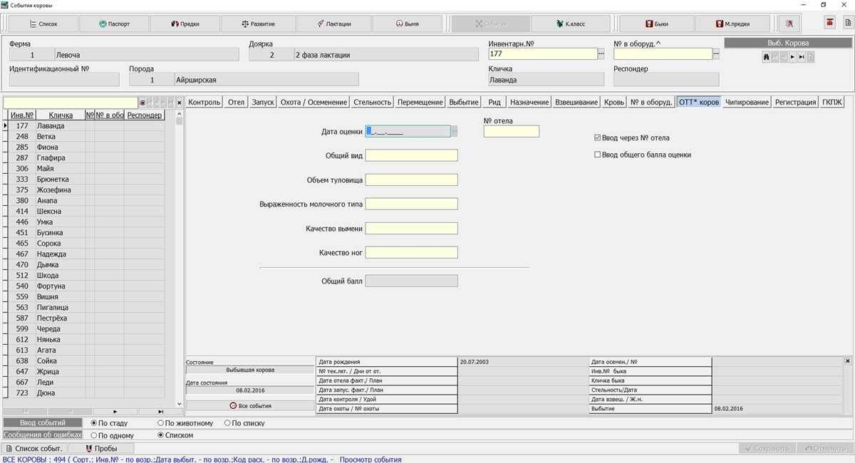 И самое главное, в новой версии Селэкса w5.50 появилась новая вкладка в «Событиях» — ОТТ (оценка типа телосложения), которая будет играть значимую роль в бонитировке скота.