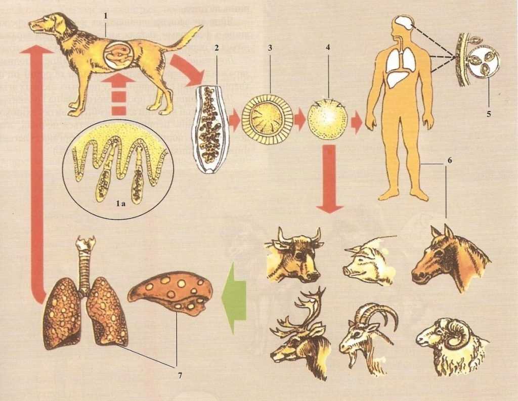 Эхинококк проходит полный жизненный цикл только в теле не травоядных животных (собак, лис, волков и т. д). В организме крс и человека паразит способен развиться от яиц только до личинок, Однако, личиночная стадия гельминта представляет не меньшую опасность для здоровья и жизни промежуточного хозяина, чем взрослые особи.