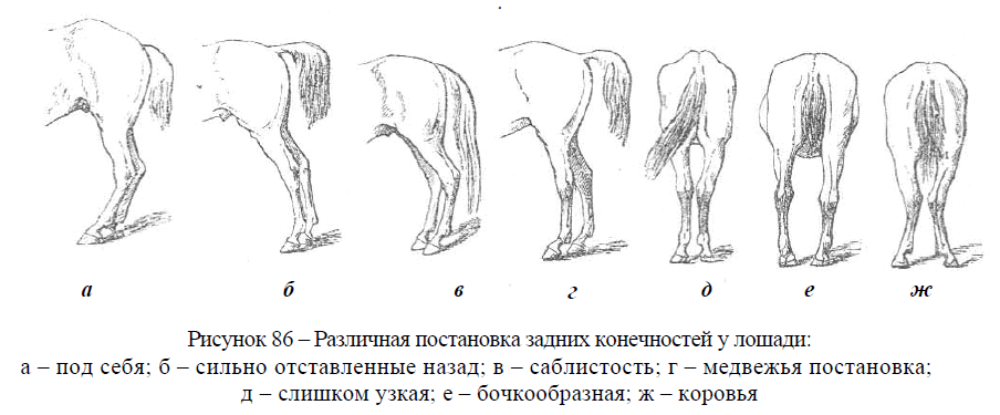 На рисунке 86 показаны варианты неправильной постановки задних конечностей у лошади.