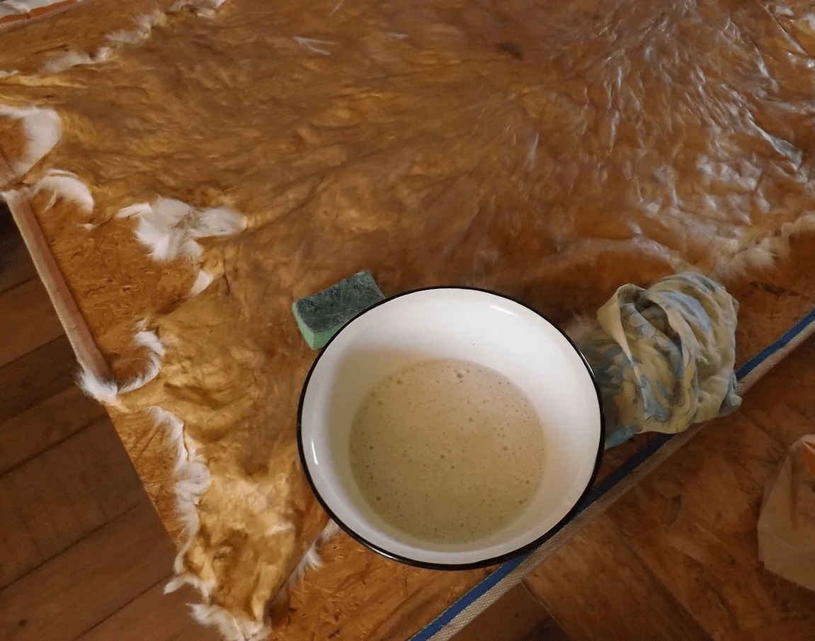 После того как смесь станет теплой, положите туда 0,5 граммов соды и 7 граммов дрожжей. Когда раствор остынет, можно погружать в него шкуры. После процесса квашения их следует промыть в воде. Теперь шкуры готовы к повторной процедуре мездрения. Протрите ткань сухой тряпкой, слегка подсушите и начинайте работу скребком.