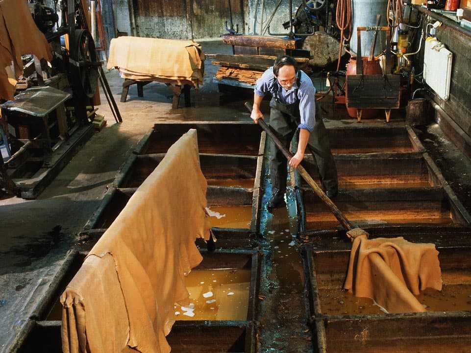 Обрабатывают кожу тремя способами. Дубление – как раз та самая обработка дубильной кислотой либо ее аналогами, квасцевание – это обработка квасцовым раствором. И, наконец, жирование означает пропитывание жиром.