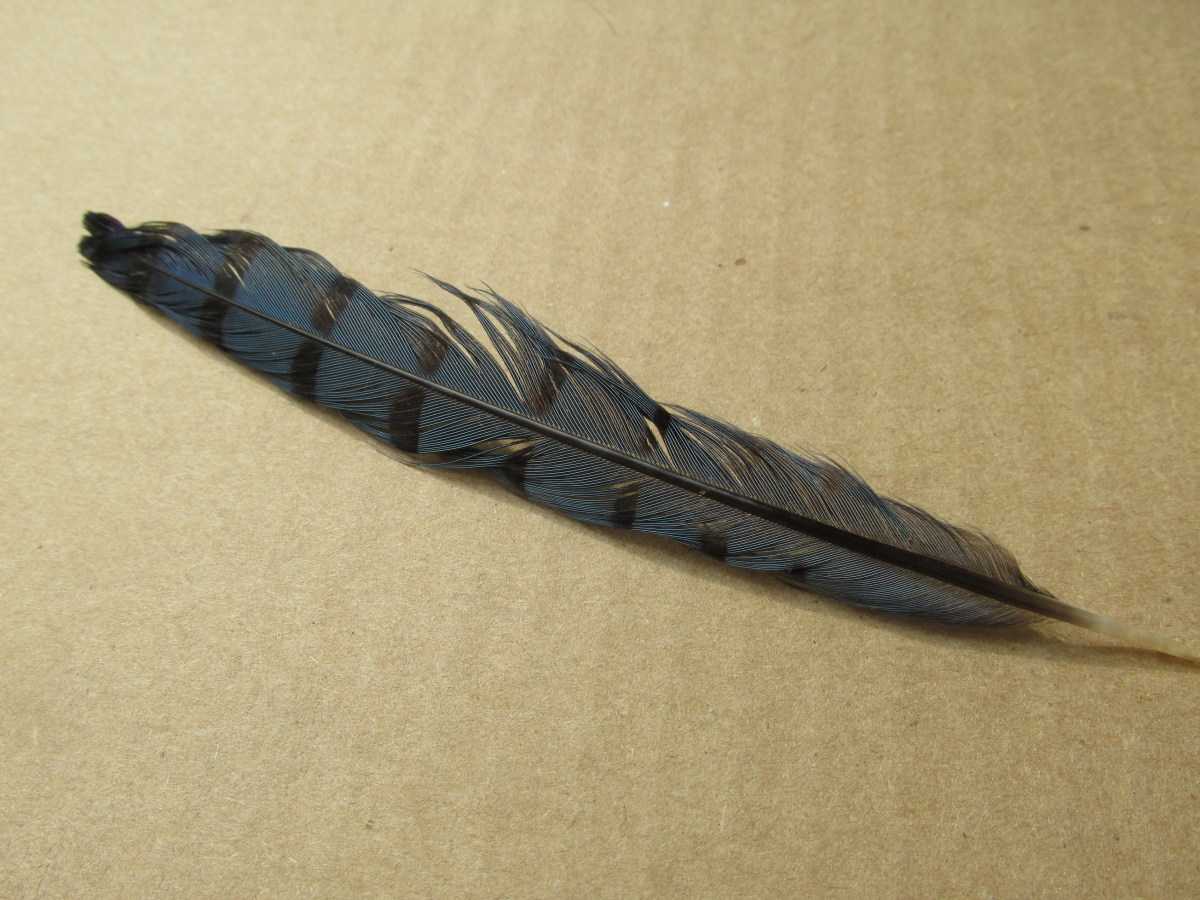 Перо голубой сойки лицевой стороной вверх выглядит синим с черными полосами.
