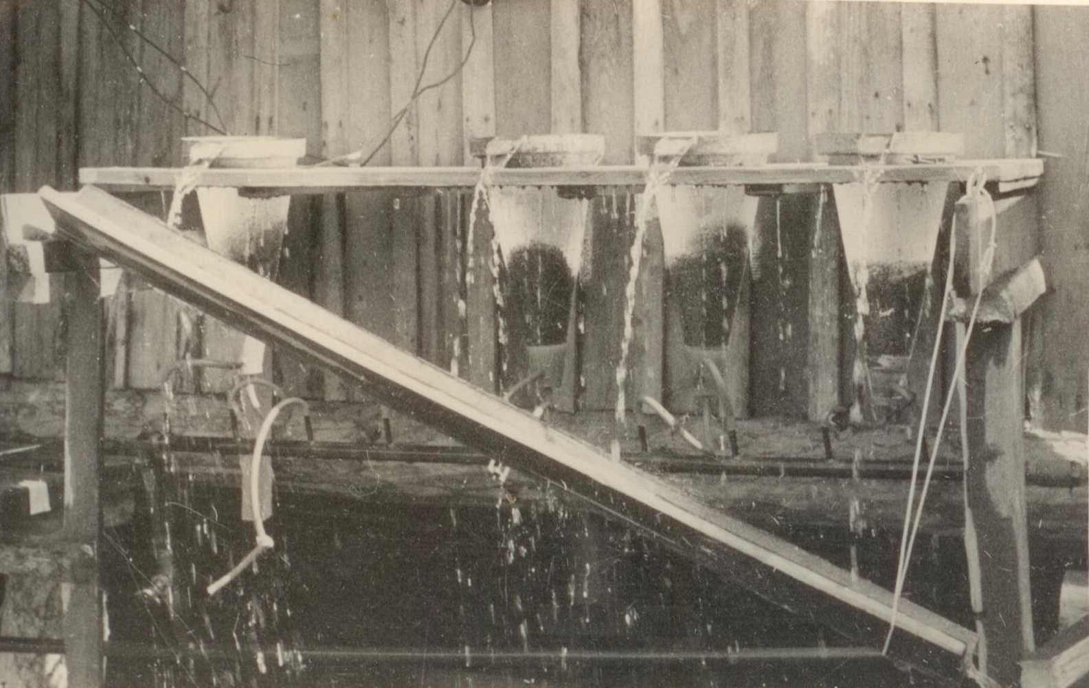 Инкубационный аппарат «Осётр» состоит из каркаса, двух ёмкостей с восемью инкубационными ящиками каждая, перекидных ковшей, водоподающего жёлоба, сливных лотков и личинкоприёмника. Вот как он устроен.