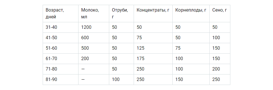 | Возраст | Количество приемов пищи | Рекомендуемый объем молока для одного кормления | Рекомендуемый объем молока в сутки | Овсяная каша | Концентраты | Грубые корма |