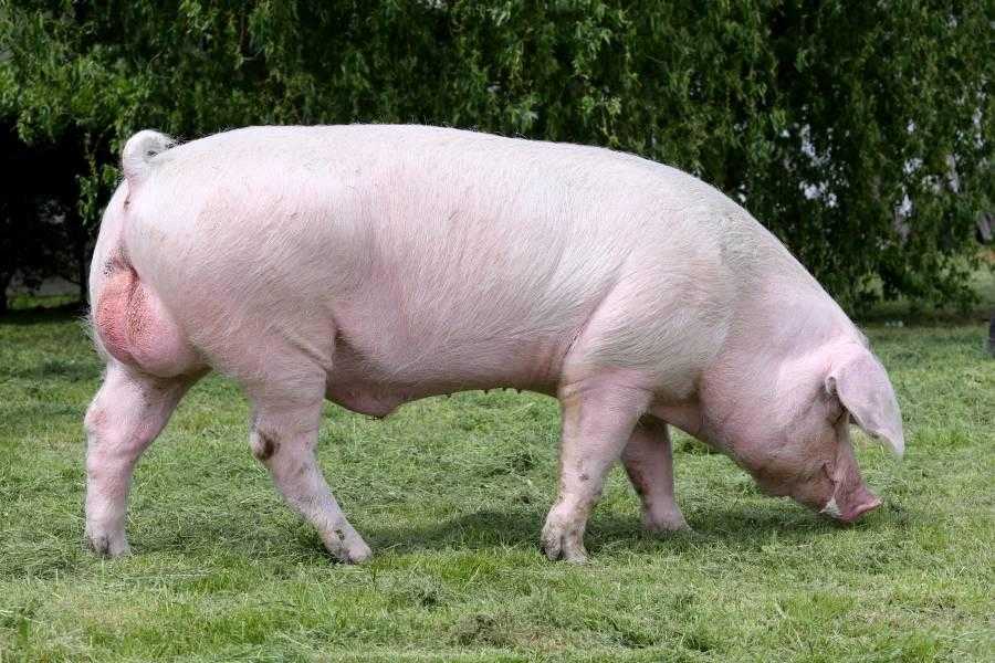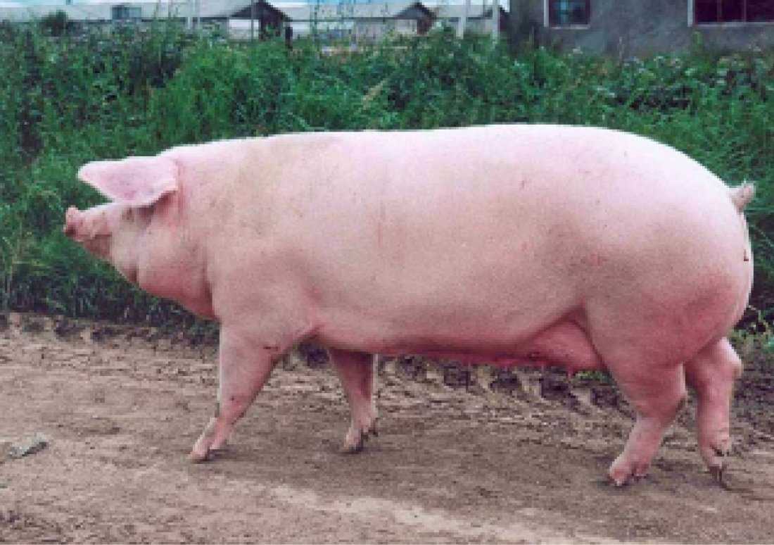Популярные свиньи мясного направления для домашнего свиноводства. Отличается белым окрасом и мягкой светлой щетиной. Средний вес особи — 270 килограмм, с одной головы удается получить 68% мяса.