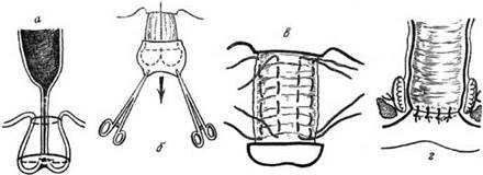 Перед проведением операции назначается голодная диета. Операция проводится планово в условиях стационара. При этом животное жестко фиксируется, производится операционный разрез необходимого размера. Далее удаляются пораженные ткани и проводится соединение кишечника внутренним швом. При необходимости истощенным животным устанавливается трубка для кормления.