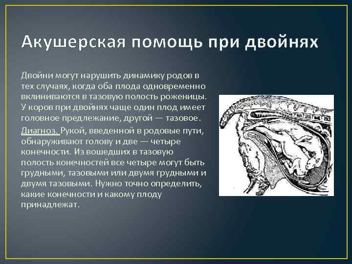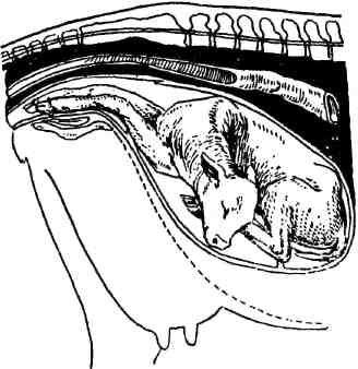 Поворот вокруг продольной оси всего органа, одного рога или участка рога. Коровы, овцы, козы, плотоядные. Конкретные причины: резкие и быстрые движения животного, во время беременность или при рождении плодов. При вставании, при толчках в боковую стенку (например, в дверях), при падениях, во время колик, тимпании и т. д. беспокойство, отсутствие аппетита, температура нормальная. Во влагалище может быть винтообразная складчатость, если оно захвачено. При ректальном исследовании – складки, одна связка натянута, другая расслаблена. Диагноз: учитывают, в какую сторону повернута матка. Прогноз зависит от степени скручивания и стадии беременности. Помощь: при небольшом скручивании во время родов выпрямляется в момент вытягивания плода при одновременном его повороте. Можно расправлять через прямую кишку, если шейка не раскрылась. При этом акушер поворачивает матку изнутри, а два помощника – снаружи, один толкает вверх со стороны, куда скрутилась, другой давит вниз с другой стороны. Можно провести поворот животного при фиксации матки, для этого производят повал, подтягивают конечности к груди и брюшной стенке веревками через спину. Укладывают животное в спинном или боковом положении так, чтобы таз был выше плечевого пояса, резко поворачивают в ту сторону, куда произошло скручивание матки. Можно фиксировать матку доской через брюшную стенку (встать на неё), при этом поворот делают плавно, животное кладут на тот бок, куда скрутилась матка.