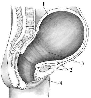 Рис. 9.1. Строение матки в родах.1 — тело матки; 2 — нижний сегмент; 3 — контракционное кольцо; 4 — влагалище