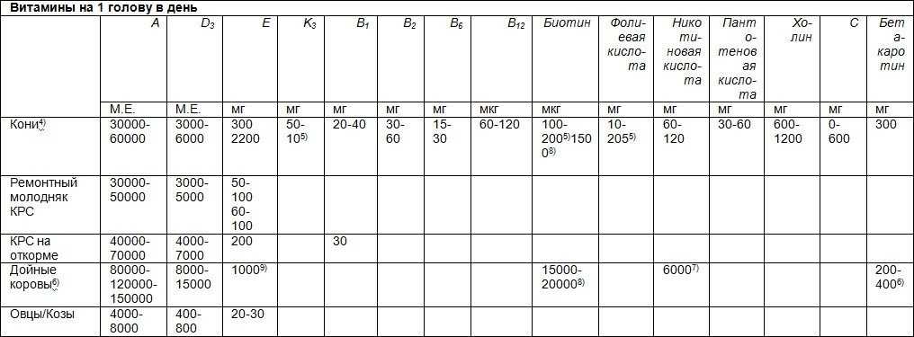 По данным Немецкого союза кормления животных («Минеральный корм в кормлении животных». 10-е издание, 2010 год. Под редакцией профессора доктора Леонарда Дурста и Лизы Кремер).