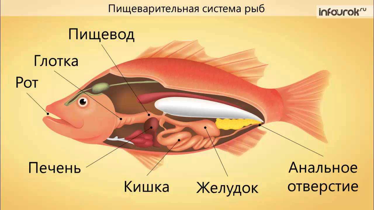 Пищеварительная система рыб начинается ртом с острыми одинаковыми зубами, сидящими на челюстях. Через рот и глотку пища попадает в пищевод и желудок, где переваривается желудочным соком.