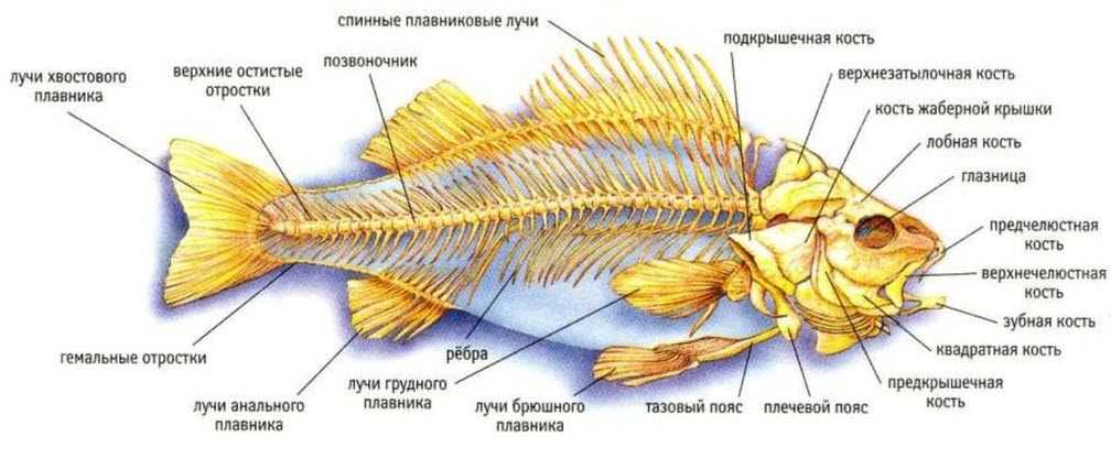 Костно-мышечная система рыб, как и у наземных животных, состоит из мышц и скелета. В основе скелета лежит состоящий из отдельных позвонков позвоночник и череп. У каждого позвонка имеется утолщенная часть, которая называется телом позвонка, а также нижние и верхние дуги. Вместе, верхние дуги образуют канал, в котором и находится спинной мозг, который защищается от травм дугами. В верхнем направлении от дуг отходят длинные остистые отростки. В туловищной части нижние дуги разомкнуты. В хвостовой части позвоночника нижние дуги образуют канал, внутри которого проходят кровеносные сосуды. Ребра примыкают к боковым отросткам позвонков и выполняют целый ряд функций, в первую очередь защиту внутренних органов, и создание необходимой опоры для мускулатуры туловища. Наиболее мощная мускулатура у рыб находится в области хвоста и спины.