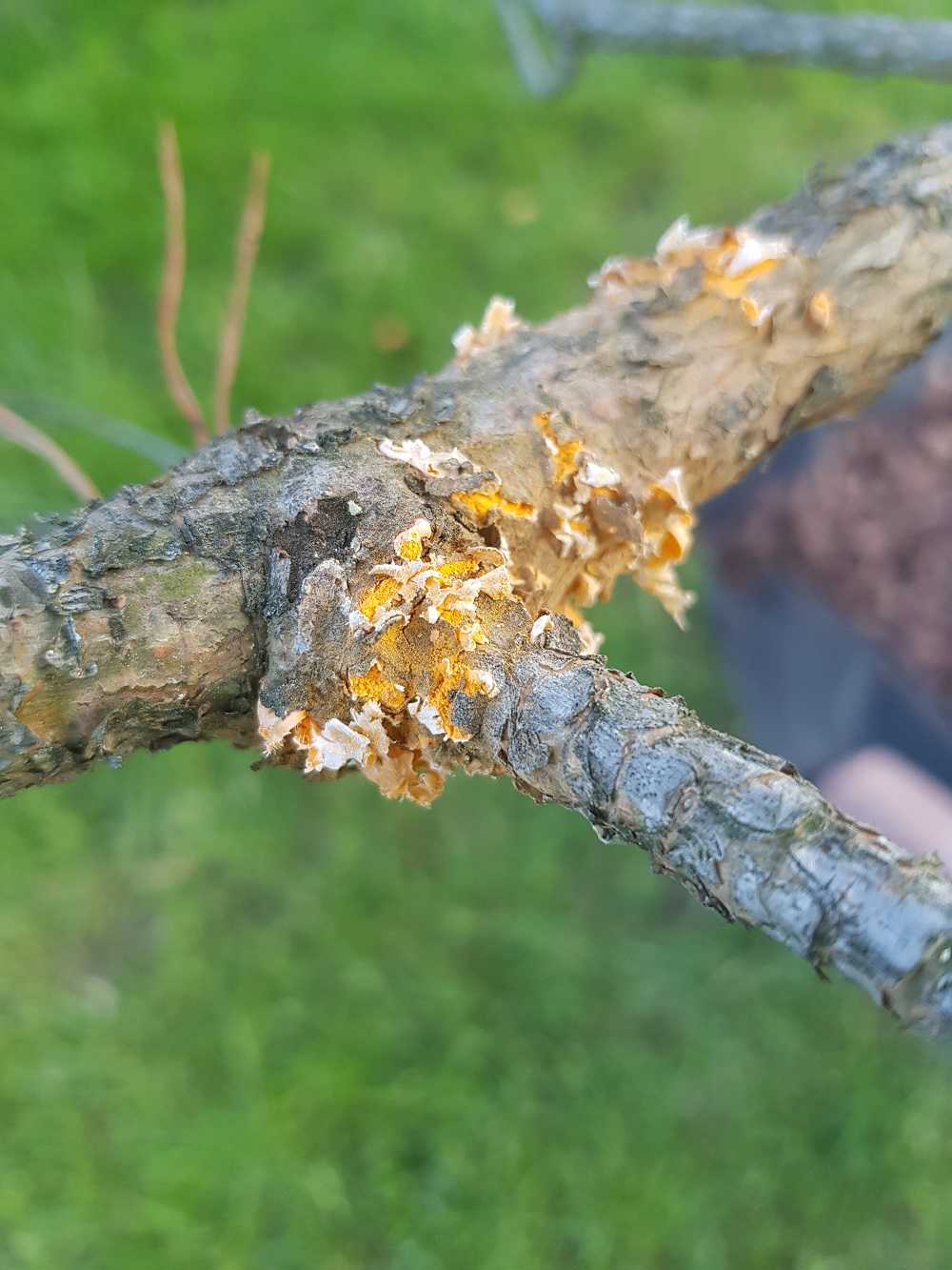 Шютте можжевельника. Заметно на прошлогодних хвоинках в виде грязно-желтого, местами бурого налета