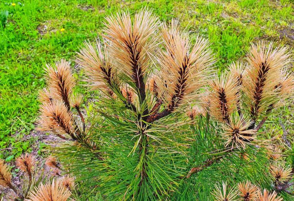 Кончики иголок начинают желтеть по разным причинам. Весной от яркого солнца возникают ожоги, появляется бронзовость. К распространенным инфекциям относятся грибковые инфекции. Ржавчина чаще появляется на сосне, поражается можжевельник. От вздутий, возникающих на ветках, споры переносятся на смородину, груши. Опасными заболеваниями считаются фузариоз, цитоспороз, фомоз. От них страдает туя. Дефекты появляются на коре, ветках. Хвоя темнеет и опадает.