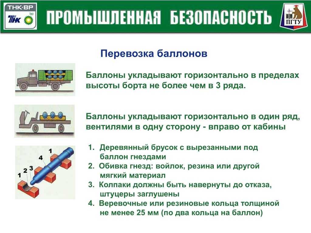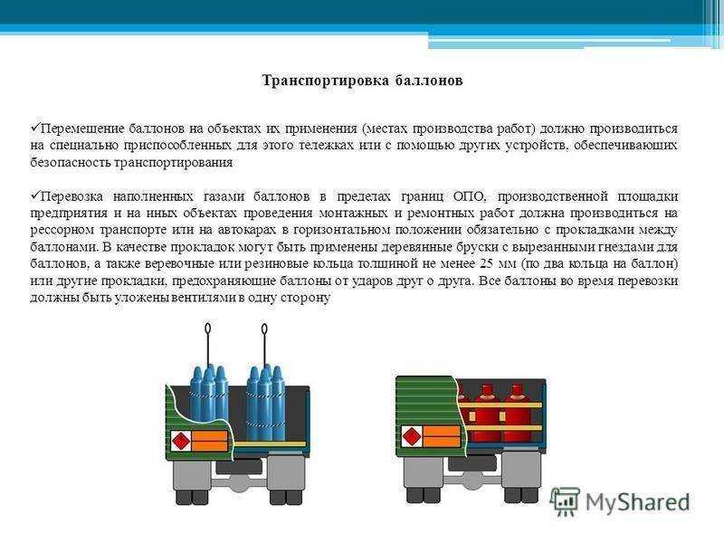 - Перевозка газовых баллонов осуществляется в специальных тарах с предохранительным оборудованием.
