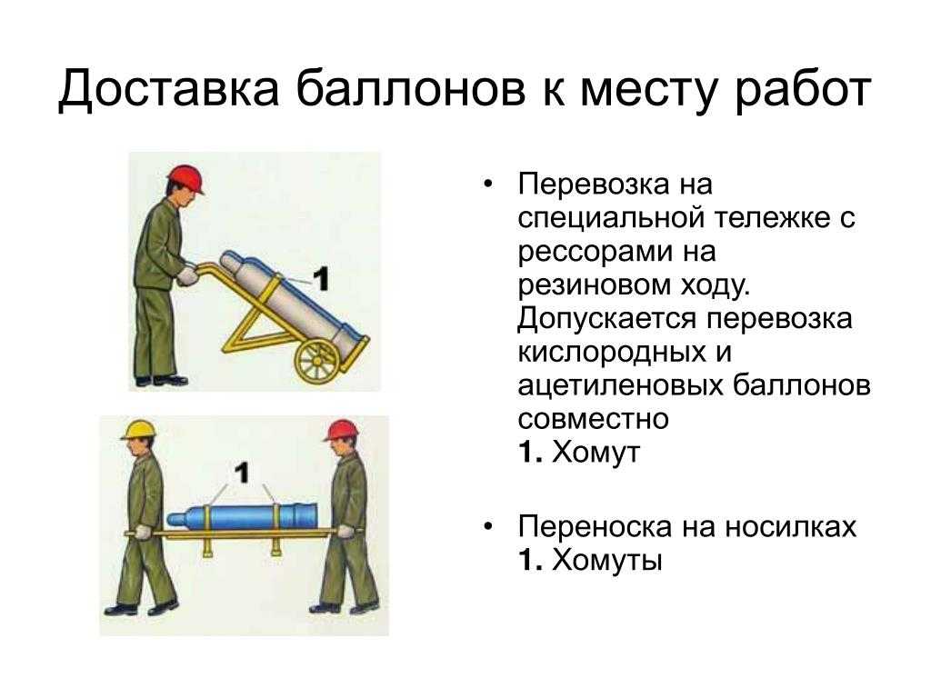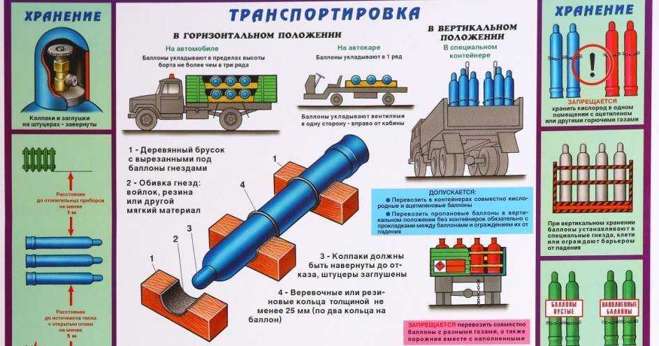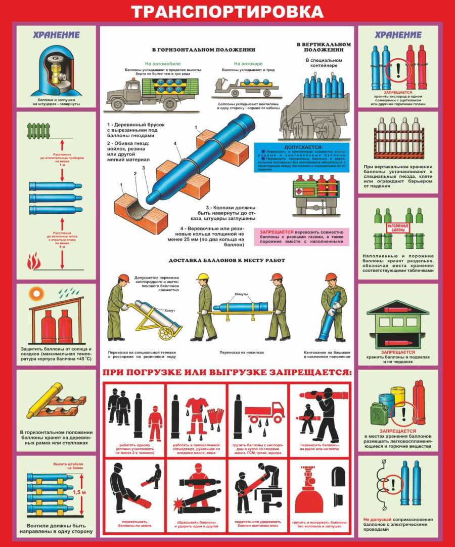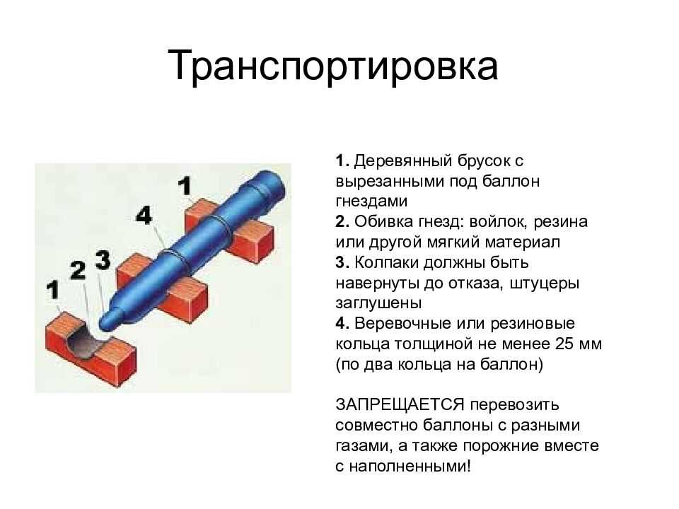 Согласно правилам перевозки кислородных и пропановых баллонов автомобильным транспортом, емкости опечатываются производителем или поставщиком, которые отвечают за правильное наполнение. Транспортировка кислорода допускается только при исключительной исправности емкостей и автомашины, наличии требуемых надписей и предохранительного колпака.