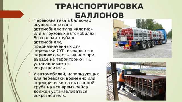 Баллоны оберегают от воздействия высоких температур, чтобы предотвратить вероятность взрыва. Создают условия, при которых груз будет защищен от взаимодействия со смазочными и другими материалами. На выхлопную трубу устанавливают искроуловитель.