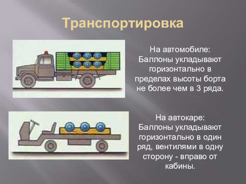 Баллоны можно перевозить исключительно в горизонтальном положении, вентили должны быть обращены в сторону салона.