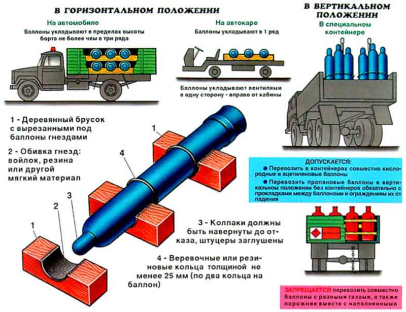 Запрещается перевозка кислородных баллонов автотранспортом с горючими газами, в том числе с пропаном. Причем речь идет как о наполненной, так и о пустой таре.