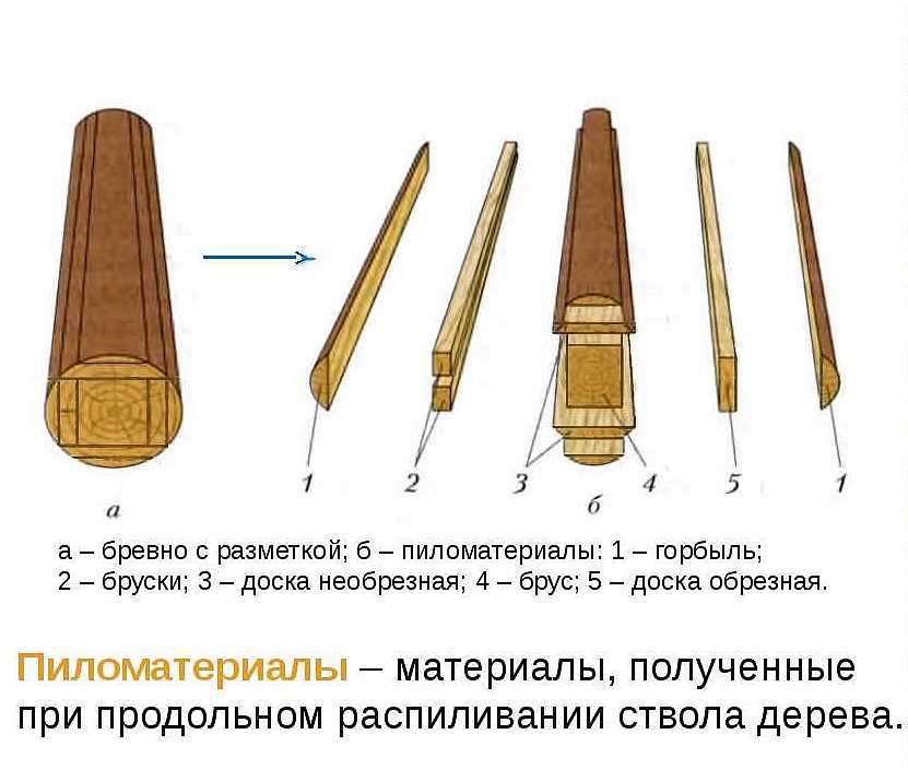Шпалы используются для строительства железных дорог. Они представляют собой брусы с широким поперечным сечением. Доски применяются в строительстве жилых домов и хозяйственных построек, а также других областях промышленности. Размеры их могут быть разными. Толщина доски составляет не менее 10 см, ширина должна иметь показатель, превышающий двойной размер толщины. Пластины – это распиленные вдоль брёвна. Четвертины – распилы вдоль по двум перпендикулярам. Брусья – материалы шириной и толщиной более 10 см. Бруски имеют толщину меньше 10 см, а ширина их составляет меньше двойного показателя толщины. При распиле брёвен на доски или бруски по бокам остаются отходы, которые называются горбылями. Также используются рейки – узкие и тонкие доски, и планки – пиленые материалы шириной 12–16 см и толщиной от 6 до 8 см.