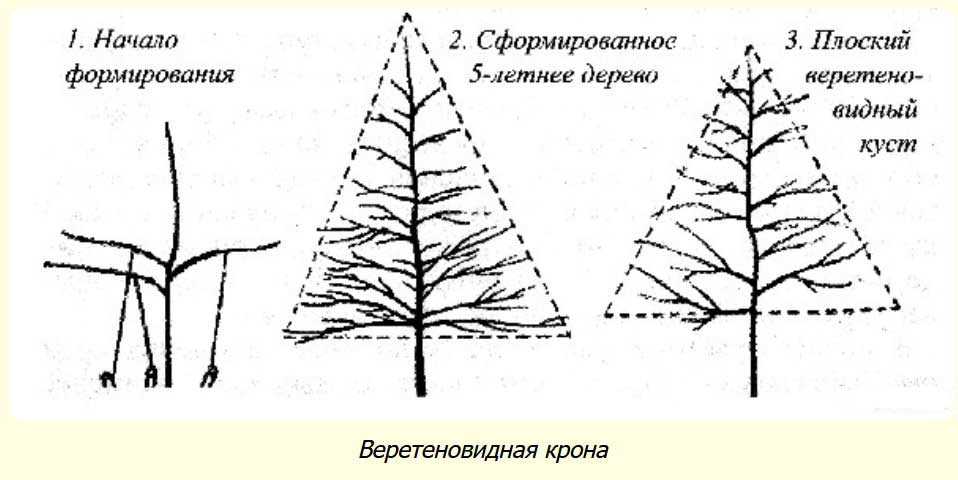 Побеги отпиливаются так, чтобы крона дерева сформировалась в виде овала. Веретенообразная схема обрезки применима для косточковых культур – сливы, абрикоса, черешни.