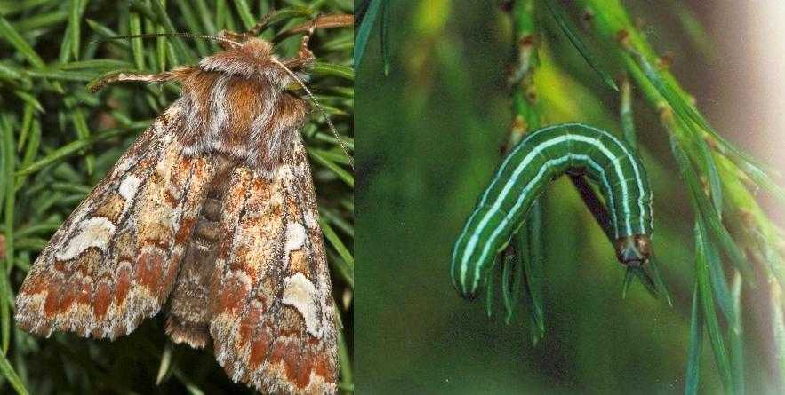 Так же неприятная гостья, которая может погостить на кедре. Самый разгар, точнее, лёт этих бабочек начинается с конца мая и продолжается до июля. Самка откладывает яйца на старой хвое, личинка развивается около 20 дней, и потом уже колоны прожорливых гусениц восседают почти на всех побегах, где ткани растения мягкие и сочные.