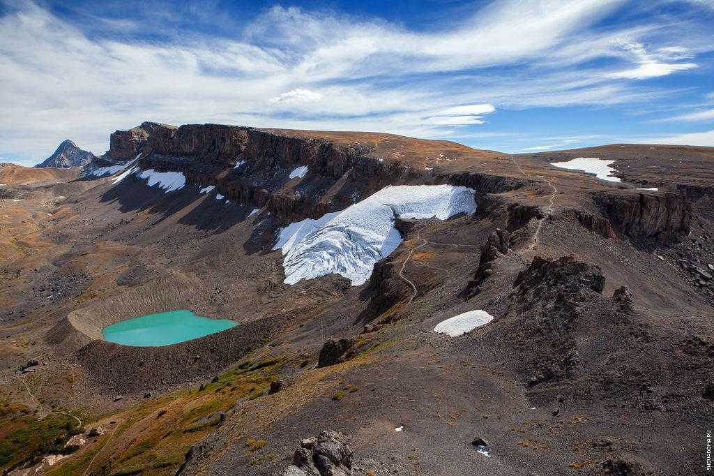 Вечные снега покрывают с северной стороны вершины на высоте 2,5 тысячи м, а на юге – от 3 км. Зимой здесь осадков выпадает больше, чем может растаять, в результате формируются массы льда. Когда он начинает подтаивать, вода перемещает ледники. Сползая вниз, они размывают поверхность грунта, передвигает камни и песок. Глетчеры обычно покрыты расщелинами.