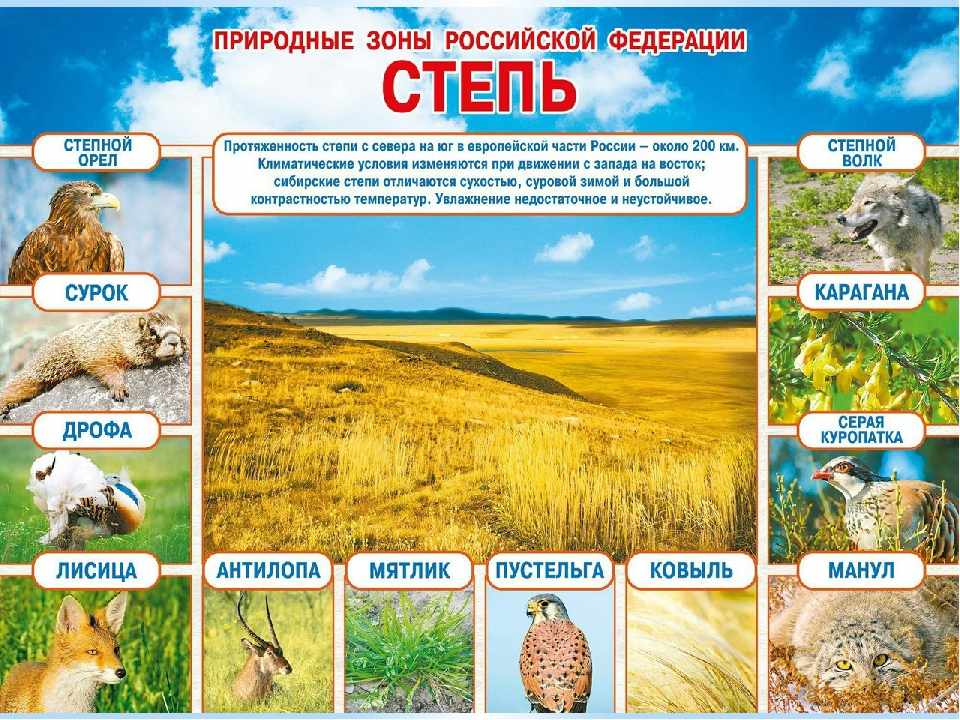 Фауну степной зоны России нельзя назвать разнообразной. Крупным животным негде спрятаться, поэтому здесь встречаются небольшие зверьки: суслики, сурки, хомяки, тушканчики и ежики. Грызунами питается степная лисица. Мелкие животные служат пищей для волков, диких котов и хорьков. Среди хищных птиц распространены совы, ястребы, луни и канюки. Кроме них, в степях обитают утки, дрофы, журавли и цапли. В степной зоне можно встретить земноводных и рептилий: лягушек, жаб, ящериц и змей. Степные антилопы, сайгаки, живут стадами, и приспособились долгое время обходиться без воды.