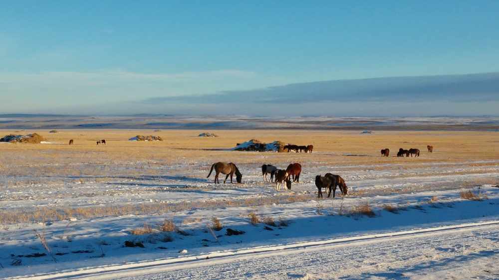 Степи на западе имеют более суровый климат, зимой, при температуре -50°C почва промерзает на 100 см. Снега выпадает мало, почти никогда не бывает оттепелей. Снежный покров сходит в середине апреля. Лето, продолжительностью три месяца, наступает в мае. Первые заморозки случаются в октябре, через месяц начинается зима.