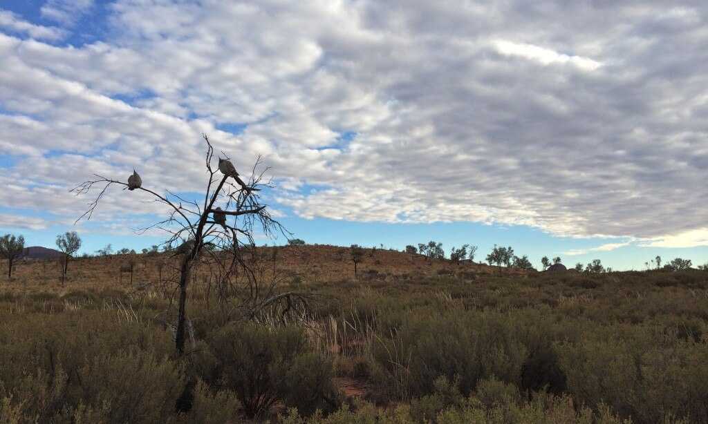 на фото типичная австралийская саванна. Группа хохлатых бронзовокрылых голубей (Ocyphaps lophotes) отдыхает на ветвях сухого пустынного дуба.