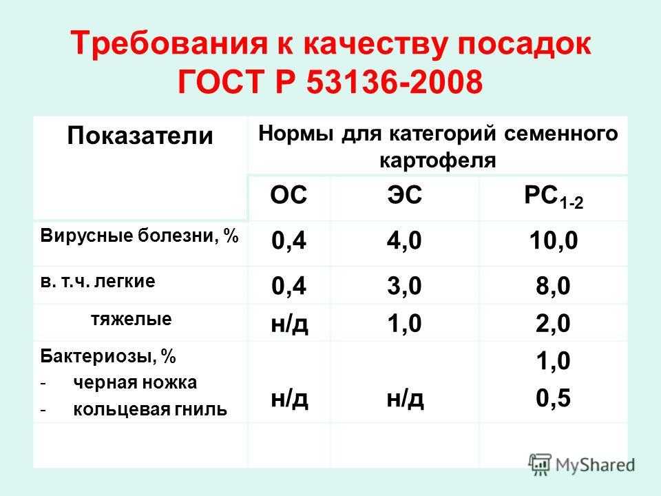 Требования к качеству посадок ГОСТ Р Показатели Нормы для категорий семенного картофеля ОСЭСРС 1-2 Вирусные болезни, % 0,44,010,0 в. т.ч. легкие 0,43,08,0 тяжелые н/д1,02,0 Бактериозы, % -черная ножка -кольцевая гниль н/д 1,0 0,5