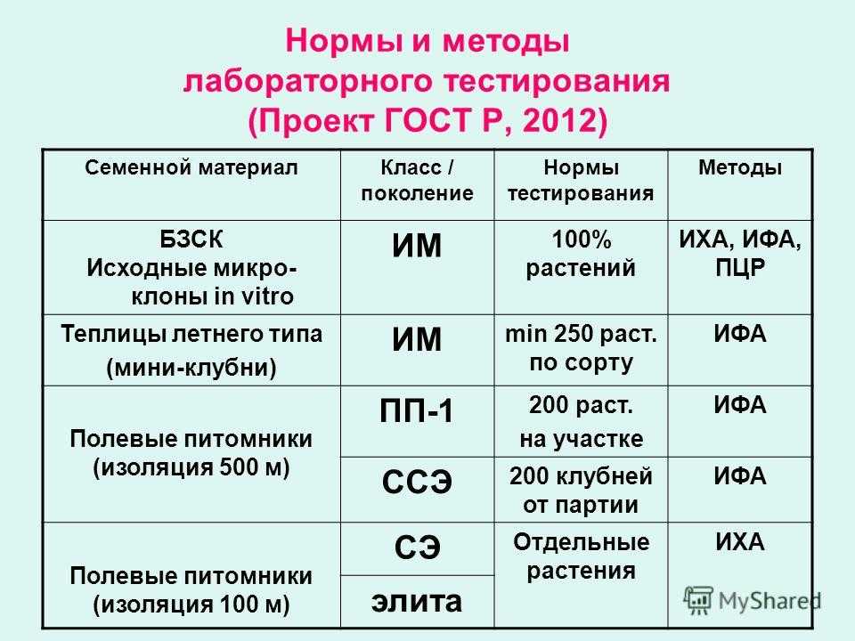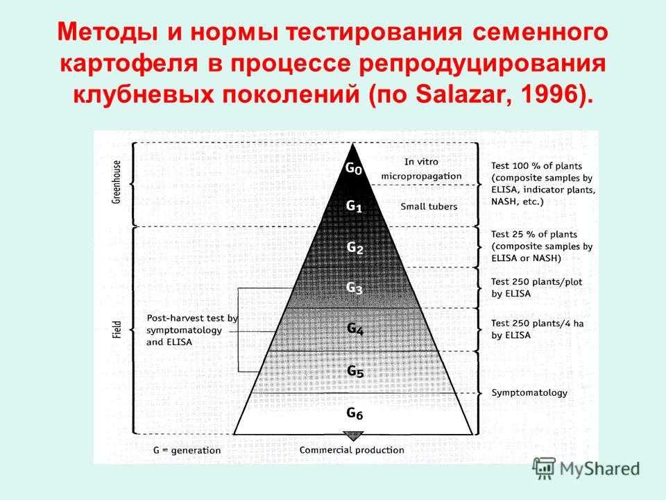 Методы и нормы тестирования семенного картофеля в процессе репродуцирования клубневых поколений (по Salazar, 1996).
