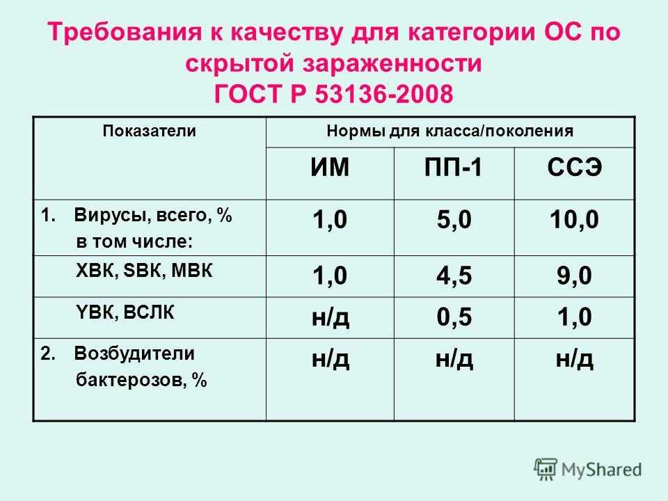 Требования к качеству для категории ОС по скрытой зараженности ГОСТ Р ПоказателиНормы для класса/поколения ИМПП-1ССЭ 1.Вирусы, всего, % в том числе: 1,05,010,0 ХВК, SВК, МВК 1,04,59,0 YВК, ВСЛК н/д0,51,0 2.Возбудители бактерозов, % н/д