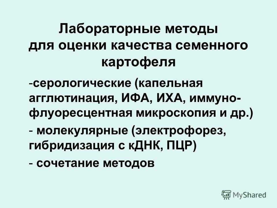 Лабораторные методы для оценки качества семенного картофеля -серологические (капельная агглютинация, ИФА, ИХА, иммуно- флуоресцентная микроскопия и др.) — молекулярные (электрофорез, гибридизация с кДНК, ПЦР) — сочетание методов