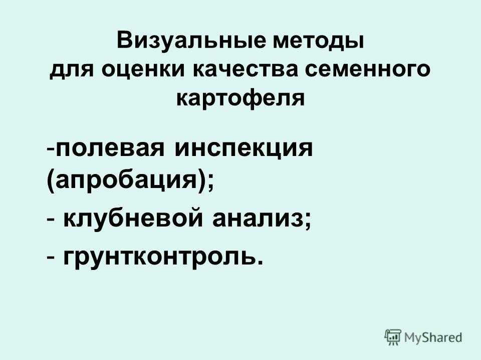 Визуальные методы для оценки качества семенного картофеля -полевая инспекция (апробация); — клубневой анализ; — грунтконтроль.