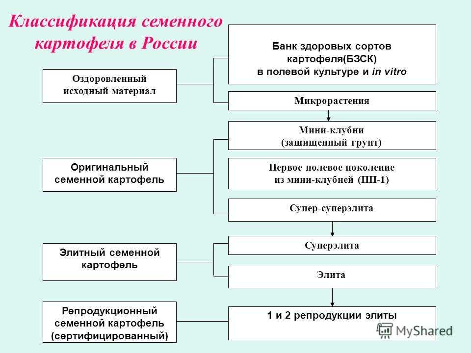 Банк здоровых сортов картофеля(БЗСК) в полевой культуре и in vitro Микрорастения Мини-клубни (защищенный грунт) Первое полевое поколение из мини-клубней (ПП-1) Супер-суперэлита Суперэлита Элита 1 и 2 репродукции элиты Оздоровленный исходный материал Оригинальный семенной картофель Элитный семенной картофель Репродукционный семенной картофель (сертифицированный) Классификация семенного картофеля в России