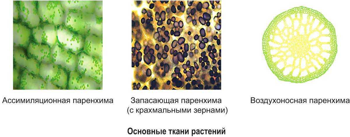 Ассимиляционная паренхима содержит хлоропласты и выполняет функцию фотосинтеза. Она содержится во всех зеленых частях растений. Запасающая паренхима состоит из крупных тонкостенных живых клеток, в которых накапливаются питательные вещества: крахмальные (картофель) или белковые (пшеница) зерна, капли жира (подсолнечник). Она хорошо развита в плодах, семенах и запасающих органах. В воздухоносной паренхиме (аэренхиме) имеются большие межклетники (полости), в которых запасается воздух, участвующий в газообмене и обеспечивающий плавучесть растений. Аэренхима содержится во всех органах водных растений, в дыхательных корнях болотных растений. Водоносная паренхима накапливает в межклетниках запас воды и хорошо развита в листьях и стеблях растений засушливых мест.