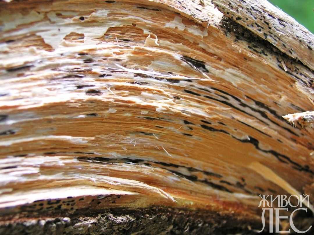гниения в древесине становятся заметны изменения ее первоначальной структуры. Она приобретает равномерный бурый цвет, в ней появляются светлые пятна и полосы, иногда черные линии, мелкие трещинки и ямки, кремовые или белые пленки. Древесина еще сохраняет достаточную твердость, но ее технические качества уже сильно снижены. -