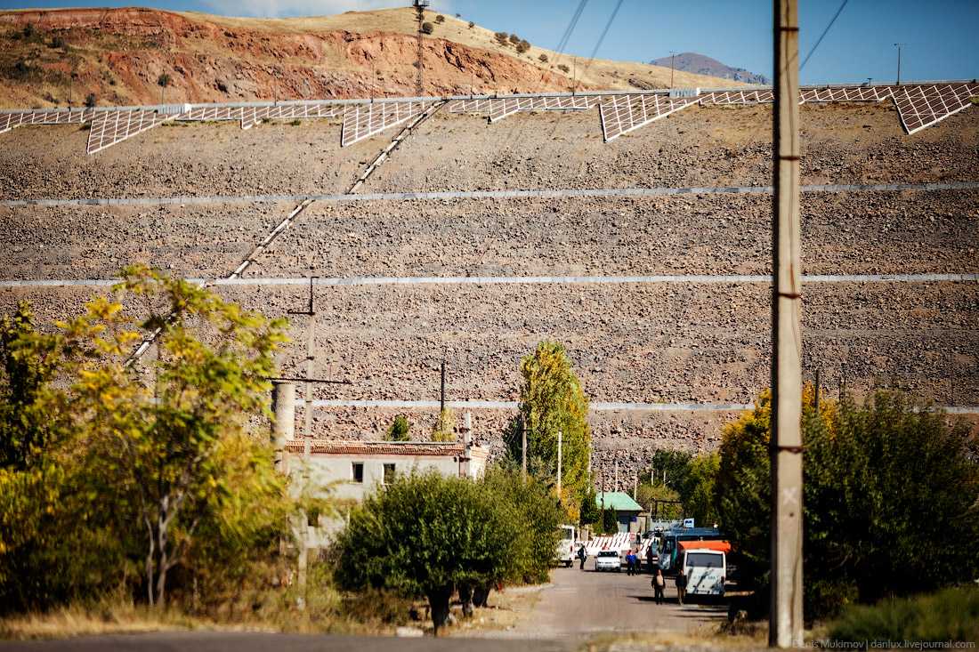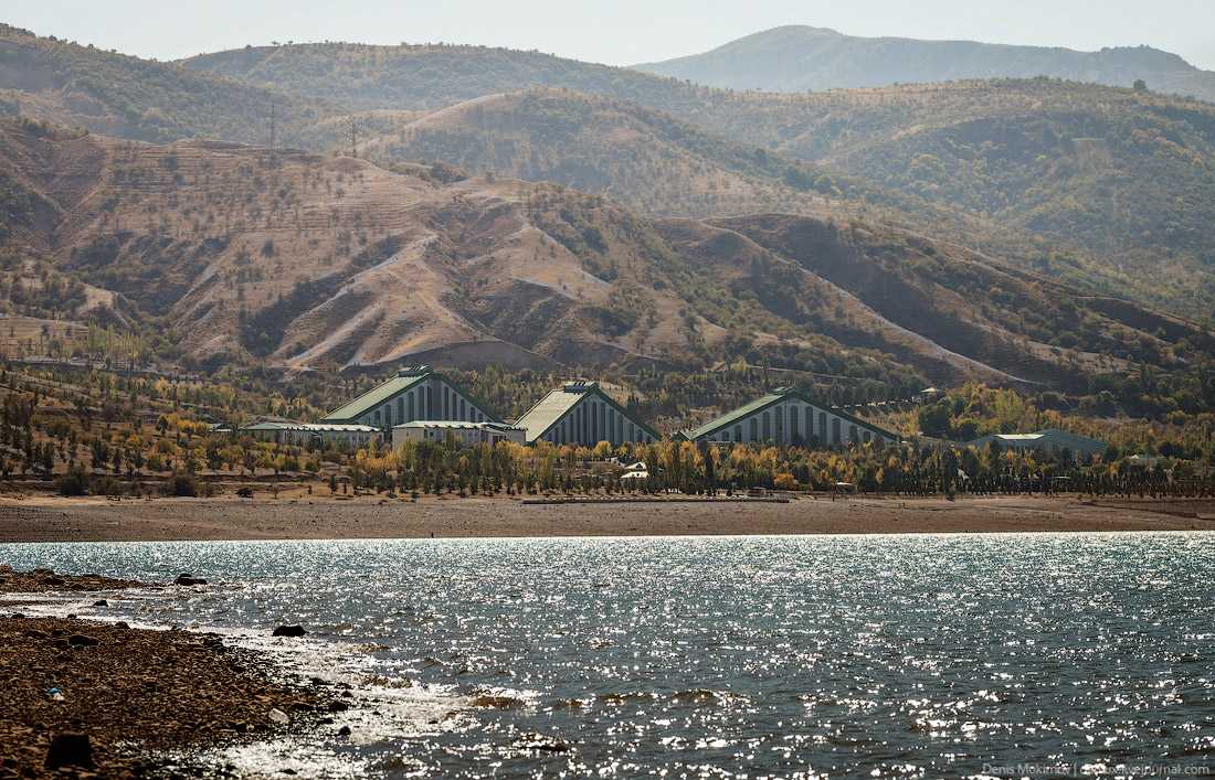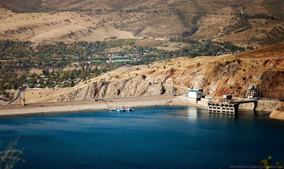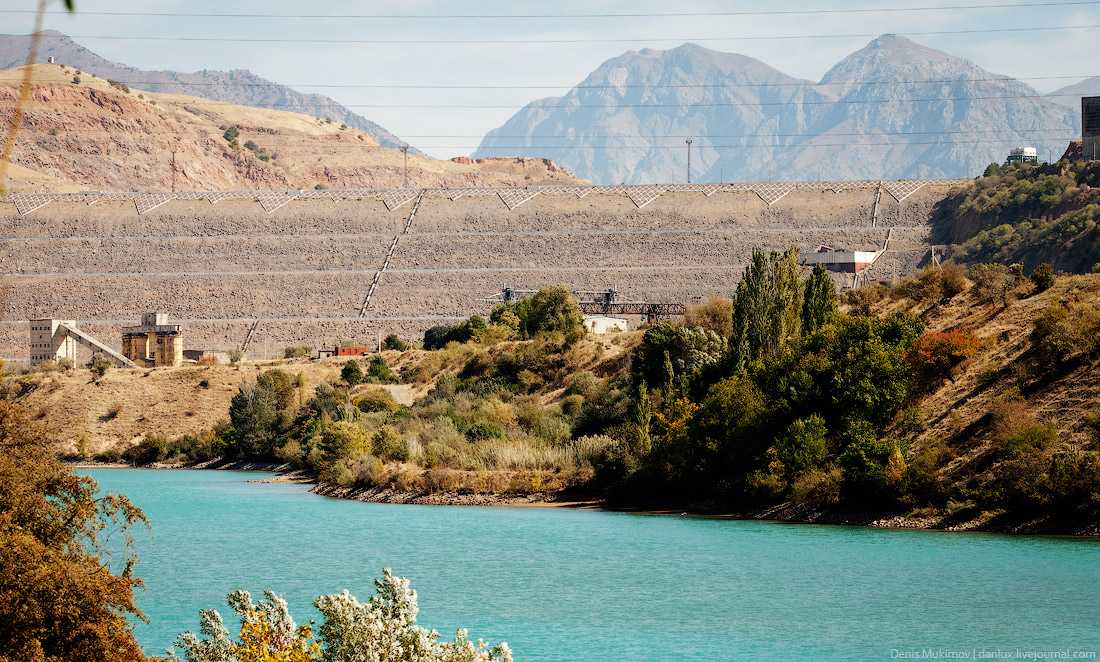 Из поселка хорошо видно градостроительное предприятие. Плотина Чарвакской ГЭС каменно-набросного типа, по сути это гигантская куча гравия с глиняным сердечником внутри — чтоб вода не просачивалась. Высота «кучи» — 168, а ширина — 770 метров. Мощность станции — около 620 МВт.