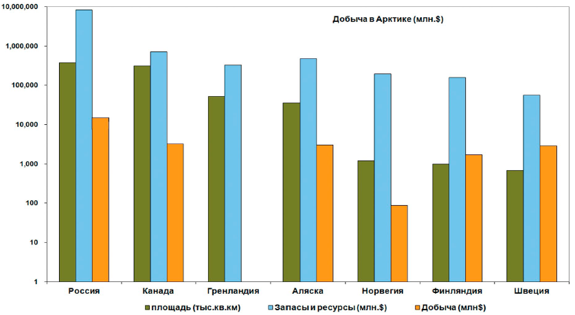 Рис. 5. Добыча, запасы минерального сырья (2017 г.) и площади национальных секторов в Арктике