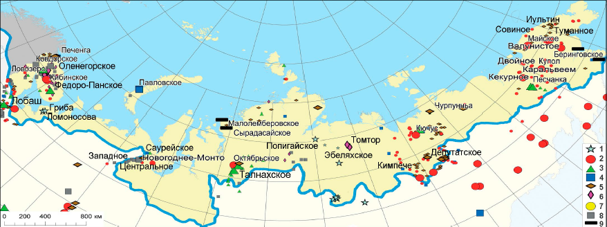 Рис. 1. Распространение месторождений твердых полезных ископаемых в Арктике (по данным ГИС-анализа)