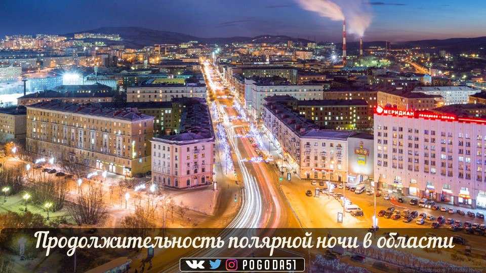 52 дня (26.11-16.01): Мыс Немецкий (полуостров Рыбачий, северная точка области)47 дней(28.11-13.01): Печенга46 дней(29.11-13.01): Заполярный, Никель Заозёрск45 дней (29.11-12.01): Видяево44 дня (30.11-12.01): Гаджиево43 дня (30.11-11.01): Полярный, Снежногорск, Териберка42 дня (1.12-11.01): Североморск40 дней (2.12-10.01) Мурманск (взяты координаты центра города)38 дней (2.12-9.01): Туманный, Кола, Молочный, Зверосовхоз, Выходной37 дней (3.12-9.01): Мурмаши, Кильдинстрой36 дней (3.12-8.01) Шонгуй, Магнетиты35 дней (4.12-8.01): Лопарская34 дня (4.12-7.01): Верхнетуломский27 дней (8.12-4.01): Оленегорск25 дней (9.12-3.01): Островной24 дня (9.12-2.01) Ловозеро23 дня (10.12-2.01): Мончегорск, Ревда15 дней (14.12-28.12): Кировск13 дней (15.12-27.12): Апатиты, Ковдор3 дня (20.12-22.12): ЗашеекПолярные Зори и южнее: полярной ночи нет