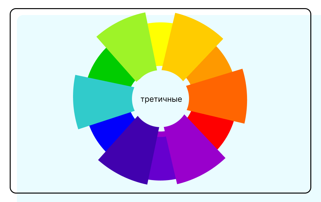 Третичные цвета (Tertiary Colors) — сине-зеленый, красно-оранжевый, желто-зеленый, красно-фиолетовый, желто-оранжевый, сине-фиолетовый