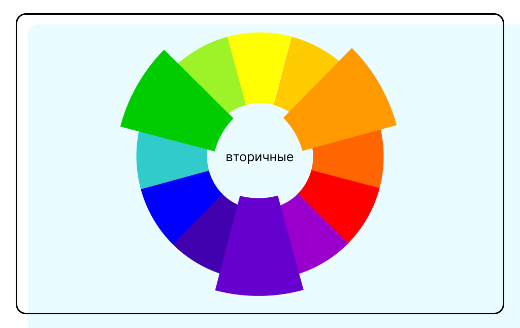 Сочетания основных цветов создают вторичные цвета — зеленый, оранжевый, фиолетовый. Их можно получить путем смешения основных: зеленый получается из желтого и синего, оранжевый — из красного и желтого, фиолетовый — из красного и синего.