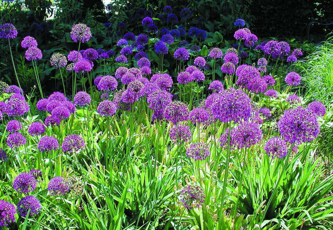 Крупные шаровидные соцветия, с которыми у нас ассоциируется декоративный лук, — это разновидности лука анзура, или горного лука. Высота растений от 1 м до 1,5-1,8 м. Их высаживают на дальнем плане цветника.