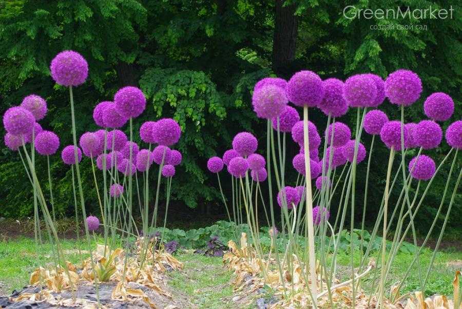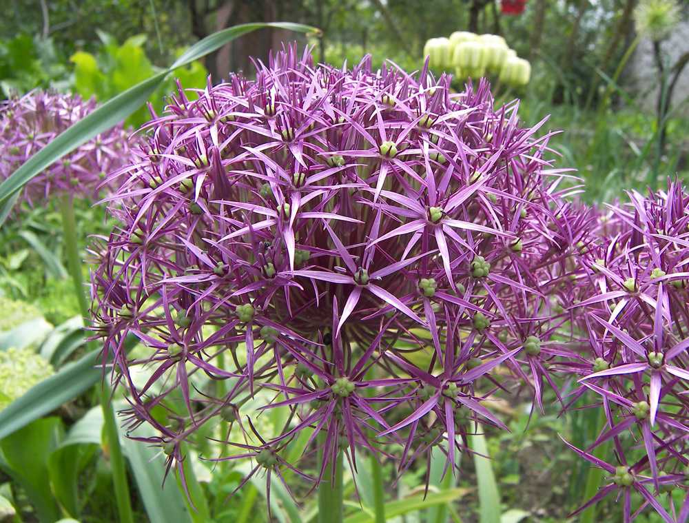 - Лук гигантский. Высота 1,2-1,8 м, диаметр цветов 15-20 см, окраска фиолетовая, лиловая, белая. Популярные гибриды: «Глоубмастер», «Самсон», «Хиз Экселленси», «Маунт Эверест».