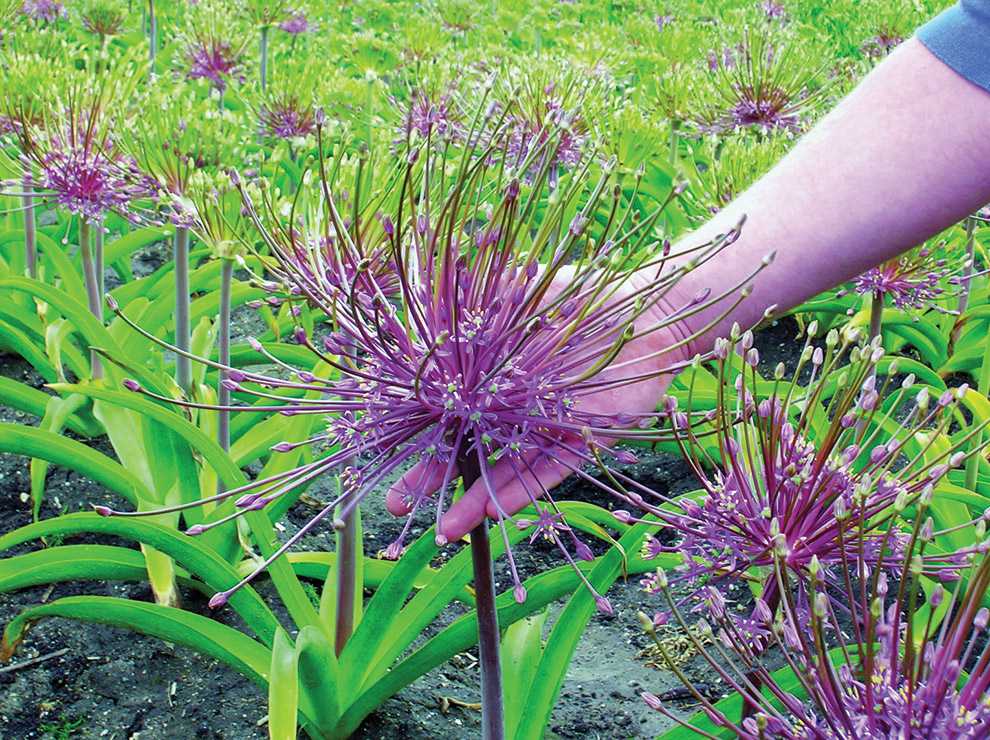 - Лук хорошенький. Высота 50-60 см. Соцветия 7-8 см в диаметре. Окраска сиреневая. Цветки на длинных поникающих цветоножках придают соцветию форму фонтана или фейерверка.