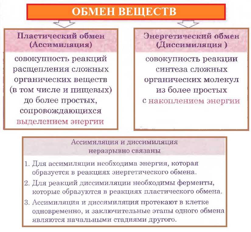 Пластический обмен {ассимиляция) — совокупность реакций синтеза сложных органических веществ (белков, жиров, углеводов и нуклеиновых кислот) из более простых. Энергетический обмен (диссимиляция) — совокупность реакций, обеспечивающих клетку энергией, в ходе которых происходит расщепление и окисление сложных органических веществ.