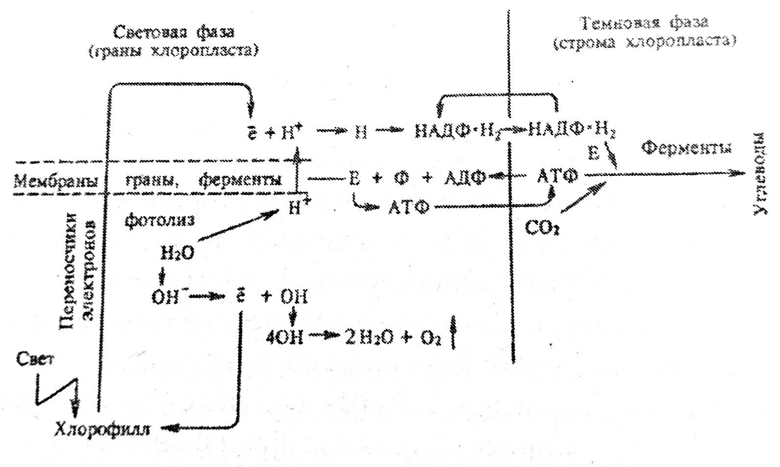 В световую фазу при поглощении квантов света электроны хлорофилла «возбуждаются» и некоторые из них отрываются от молекул хлорофилла и переходят от одного переносчика к другому по электронтранспортной цепи, накапливаясь преимущественно на внешней стороне мембраны тилакоидов. Одновременно под действием света происходит фотолиз воды с образованием ионов Н+ и ОН—. Ионы Н+ накапливаются преимущественно на внутренней стороне мембран тилакоидов. Таким образом на мембранах создается разность потенциалов (достигает 200 мВ), под действием которой Н+ проходят через ионные каналы мембран на наружную их поверхность. Выделяющаяся при этом энергия используется ферментами для присоединения остатка фосфорной кислоты к АМФ или АДФ с образованием АТФ. На наружной поверхности мембран электроны присоединяется к иону водорода (Н+), восстанавливая его до атома (Н). Далее атомы водорода соединяются с никотинамидадениндинуклеотидфосфатом (НАДФ) и восстанавливают его до НАДФН + Н+. Ионы гидроксида, оставшись без противоионов Н+, отдают свои электроны и превращаются в свобоцные радикалы ОН‚ которые‚ взаимодействуя друг с другом, образуют воду и свободный кислород: 4ОН —> 2Н2О + 02. Электроны гидроксильных групп возвращаются в молекулу хлорофилла на место ранее оторвавшихся. Таким образом, в световую фазу фотосинтеза, которая протекает на мембранах тилакоидов и гран хлоропластов только на свету, происходят процессы: